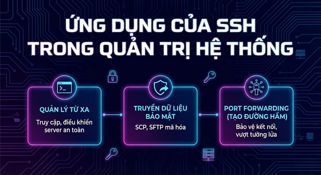 - Quản trị máy chủ từ xa: SSH cho phép quản trị viên kết nối từ xa vào máy chủ một cách an toàn để thực hiện các lệnh quản lý, bảo trì hệ thống mà không cần truy cập trực tiếp. Điều này đặc biệt quan trọng đối với máy chủ đám mây, VPS hoặc các hệ thống Linux/Unix.