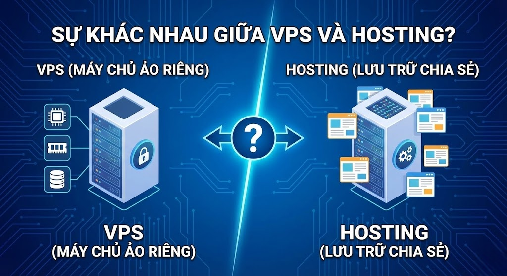 Sự khác biệt lớn nhất nằm ở hiệu suất và tính ổn định. Với Web Hosting, do phải chia sẻ tài nguyên phần cứng, website của bạn rất dễ bị ảnh hưởng bởi “hàng xóm”. Nếu một website khác trên cùng máy chủ bị tấn công hoặc có lượng truy cập tăng đột biến, website của bạn cũng sẽ bị chậm theo. Ngược lại, VPS sử dụng công nghệ ảo hóa để phân tách tài nguyên độc lập. Mỗi VPS sở hữu lượng CPU, RAM và địa chỉ IP riêng biệt. Điều này đảm bảo hiệu năng website của bạn luôn ổn định, không bị ảnh hưởng bởi bất kỳ ai khác và an toàn hơn trước các rủi ro lây nhiễm mã độc chéo.
