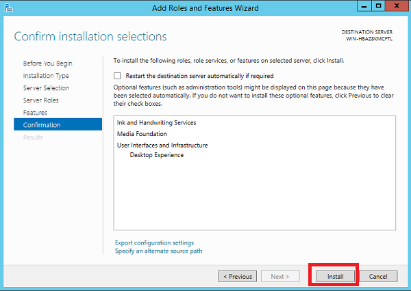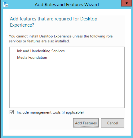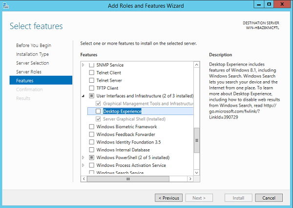 – Cửa sổ Add roles and feature hiện ra, các bạn nhấn Next cho đến khi menu bên trái đến phần Feature. Tìm trong menu Feature phần User Interfaces and infrastructure chọn tích vào Desktop Experience.