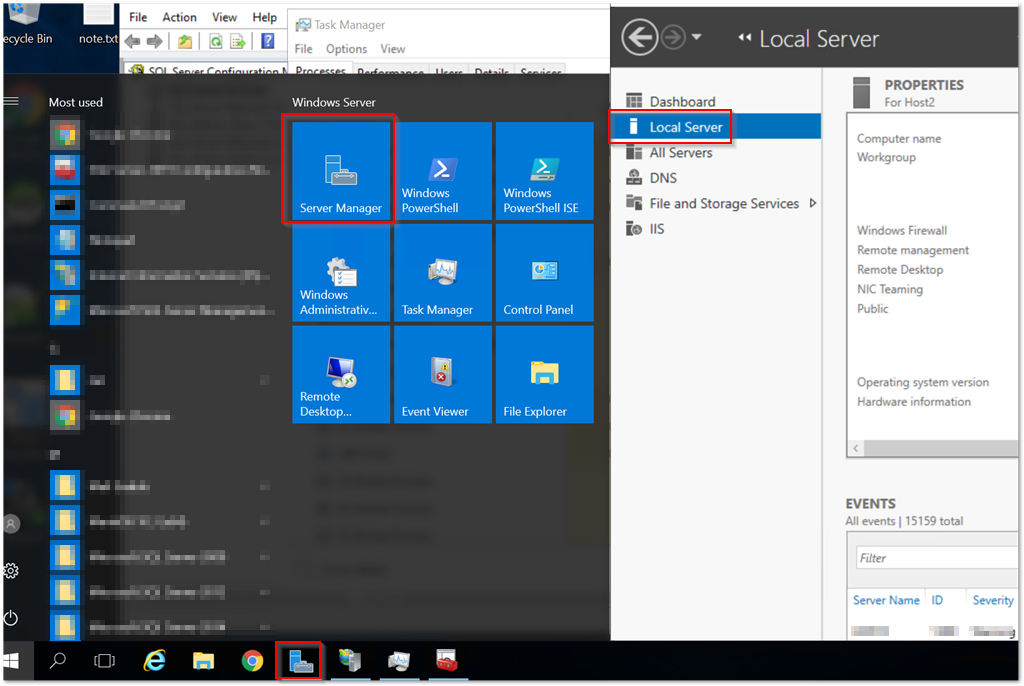 1. Chọn Server Manager trong Start của Windows để khởi động ứng dụng hoặc chọn Server Manager ngay tại Window Task.