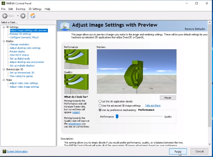 Trong mục Nvidia Control Panel – chọn Adjust image settings with Preview – Chọn use my preferece emphazising và kéo xuống mức thấp nhất như trong ảnh.