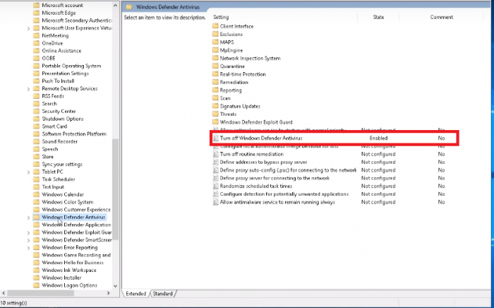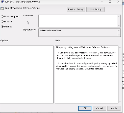 – Administrative Templates – Windows Components – Windows Defender Antivirus – chọn Turn off Widows Defender Antivirus.